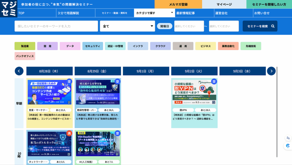 IT・クラウド関連からセキュリティ、DX、人事、業務効率化まで幅広いテーマの「本気の問題解決セミナー」を提供。