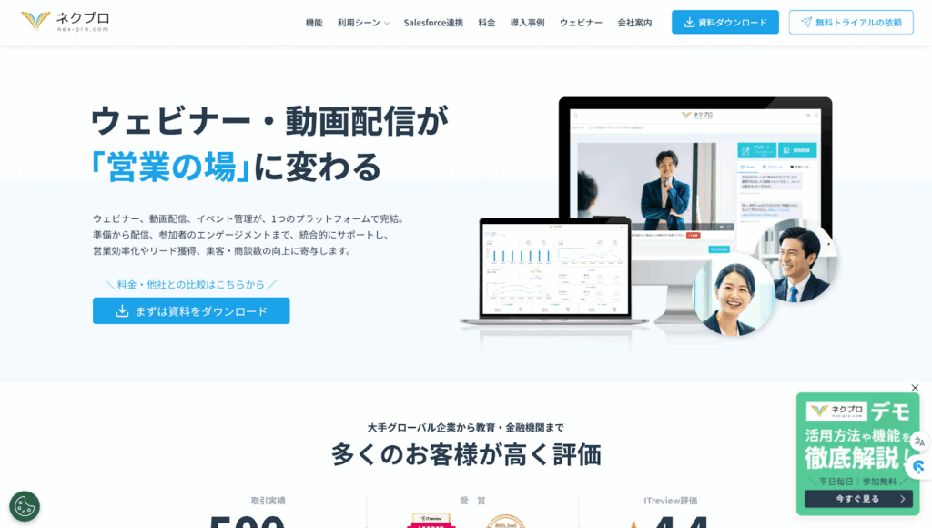 500社超導入、高評価(ITreview 「ウェビナーツール部門11期連続」「動画配信部門13期連続」)で、準備・配信・分析までカバーし営業効率化とリード創出を支援。