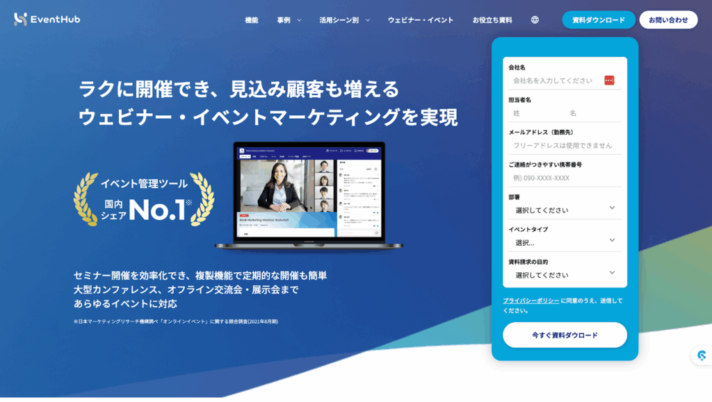 オンライン・オフライン・ハイブリッドに対応し、セミナー、カンファレンス、展示会まで幅広くサポートするイベントマーケティングプラットフォーム。
