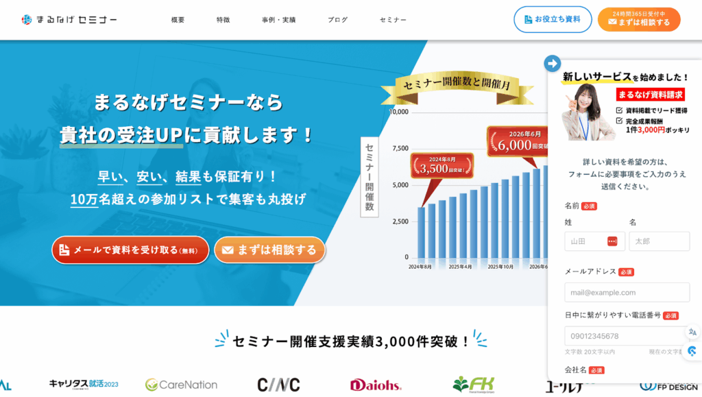 3,000件超の開催実績と累計6万人以上の参加者、商談獲得率15%以上、1件あたり3,000円という業界屈指のコスパを誇ります。
